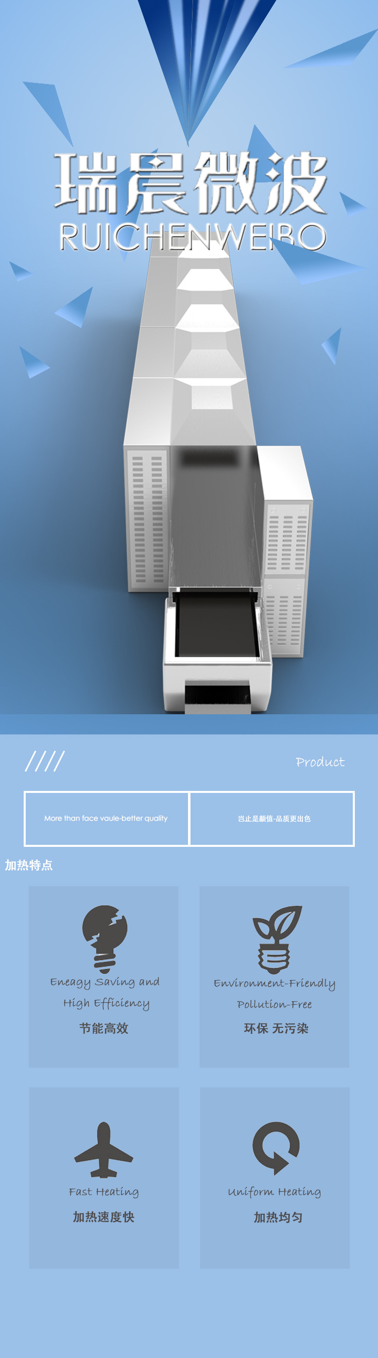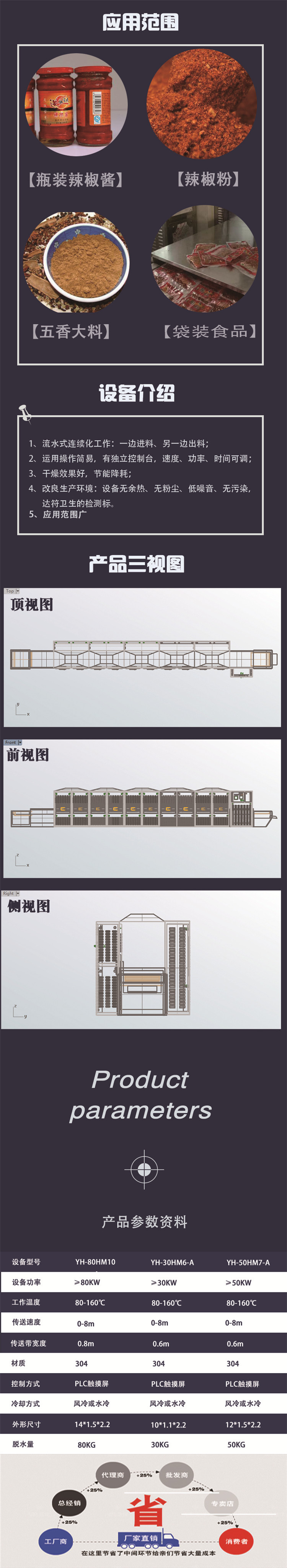 一、调味品微波干燥的特点: 1、选择性加热。因为水分子对微波吸收好,所以含水量高的部份,吸收微波功率多于含水量较低的部份。 2、效率高。微波是直接对物料进行作用,因而没有额外的热能损失,炉内的空气与相应的容器都不会发热,所以热效率高,生产环境也明改善,与远红外加热相比可节电30%。 3、时间短,效率高。微波加热是使被加热物体本身成为发热体,不需要热传导的过程。微波从四面八方穿透物体内部里外同时使物体在很短时间内达到均匀加热,大大缩短了干燥时间。 4、易于控制,工艺先。与常规方法比较,设备即开即用;没有热惯性,操作灵活方便;微波功率可调,传输速度可调。在微波加热,干燥中,无废水,无废气 二、微波杀菌的特点: 微波杀菌是利用了电磁场的热效应和生物效应的共同作用的结果。微波对细菌的热效应是使蛋*白质变化,使细菌失去营养,繁殖和生存的条件而死亡。微波对细菌的生物效应是微波电场改变细胞膜断面的电位分布,影响细胞膜周围电子和离子浓度,从而改变细胞膜的通透性能,细菌因此营养不良,不能正常新陈代谢,细胞结构功能紊乱,生长发育受到抑制而死亡。此外,微波能使细菌正常生长和稳定遗传繁殖的核酸RNA和脱氧核糖核酸DNA,是由若干氢键松弛,断裂和重组,从而诱发遗传基因突变,或染色体畸变甚至断裂。 微波杀菌可很好地保持营养成份和传统风味,微波能穿透物料内部,频率2450MHz,以每秒24亿5千万次振荡,通过热效应和非热效应杀死细菌,与常规热力杀菌相比,能在比较低的温度和较短的时间,就能获得所需的杀菌效果。实践证明,一般在70℃就可杀死大肠杆菌,在70—80℃细菌总数大大降低,时间只需2~3分钟。速度快,时间短,因此保留食品中的营养成份、传统风味。延长保质期 三、调味料微波设备也可适用于:(鸡肉香精、牛肉香精、猪肉香精、酵母精、海鲜精、海鲜高汤精、海鲜高汤粉、排骨精、排骨高汤精、排骨高汤粉、香辛料、辣椒粉)和对脱水蔬菜、海产品香料(海带、紫菜、鱼、虾)等的加热、灭菌干燥。 四、设备型号参数: 1、型号:RC-60KWHM 2、电源输入:三相380±10%50HZ; 3、输出微波功率:60KW(功率可调) 4、微波频率:2450MHz±50MHz 5、传输带宽度:800mm,材料:特氟龙 6、传输速度:0.5~10米/分(变频无*调速) 7、工作环境:-5—60℃、相对湿度≤80% 8、实时温度显示,物料温度可控范围:40-120℃ 9、脱水效率:60公斤/小时 10、杀菌效率:800公斤/小时 11、整机不锈钢制造 12、设备(长×宽×高):13600×1365×1700mm 微波泄漏:符合国家GB10436—89标准≤5mw/cm2